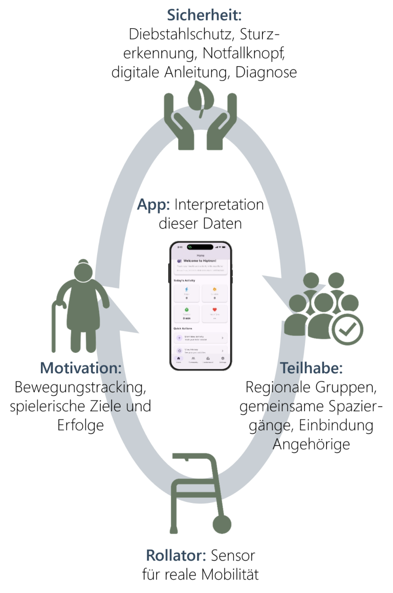 Der Rollator wird zum Sensor für reale Mobilität. Die gekoppelte App sorgt für drei zentrale Bedürfnisse: